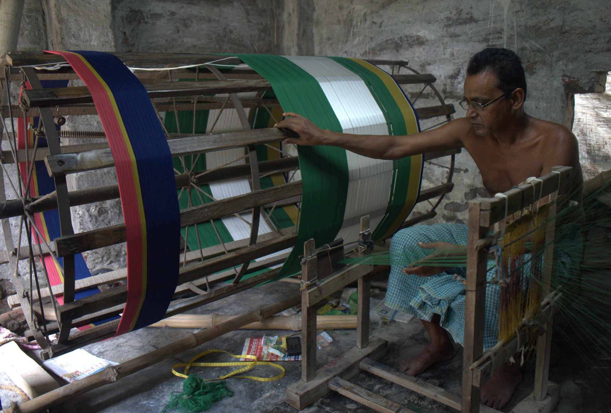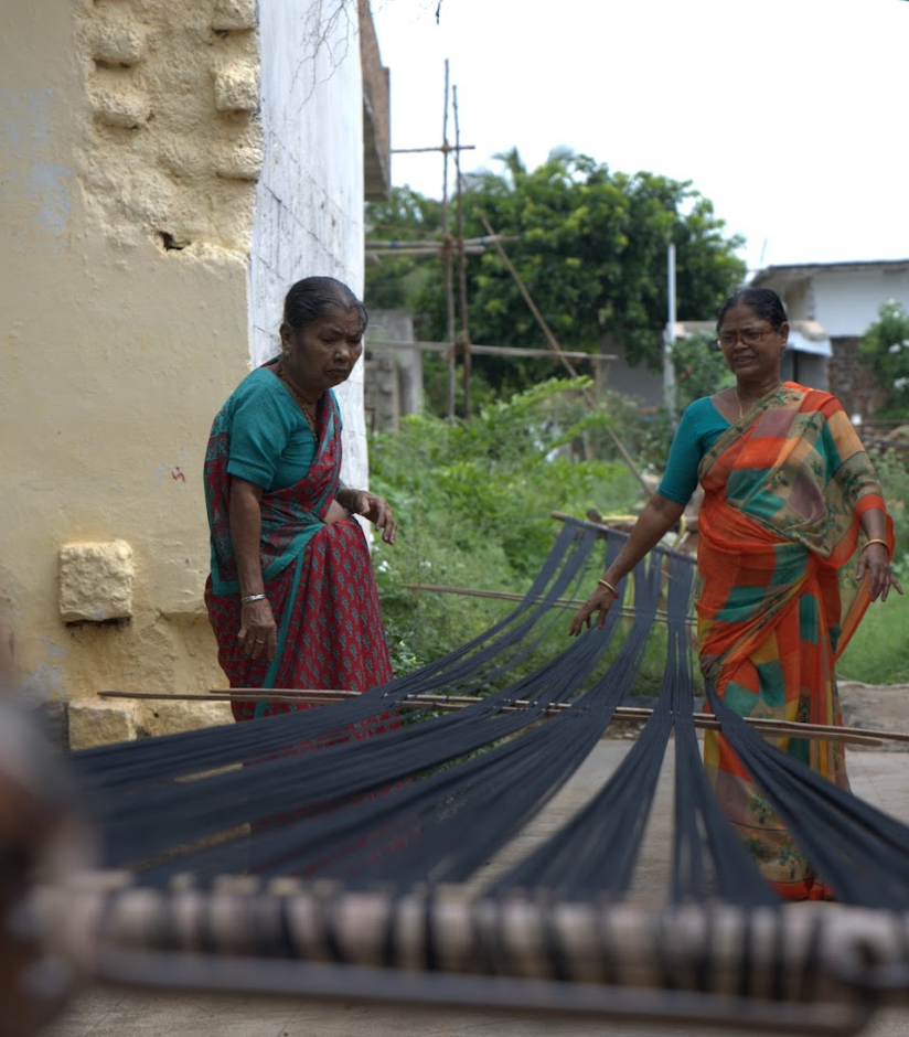 The dyed and dried yarn is combed and separated by hand, spread across two poles. This helps the yarn retain its colour and also, allows the weaver to apply starch to the threads, making them crisp and ready - for winding the bobbins.