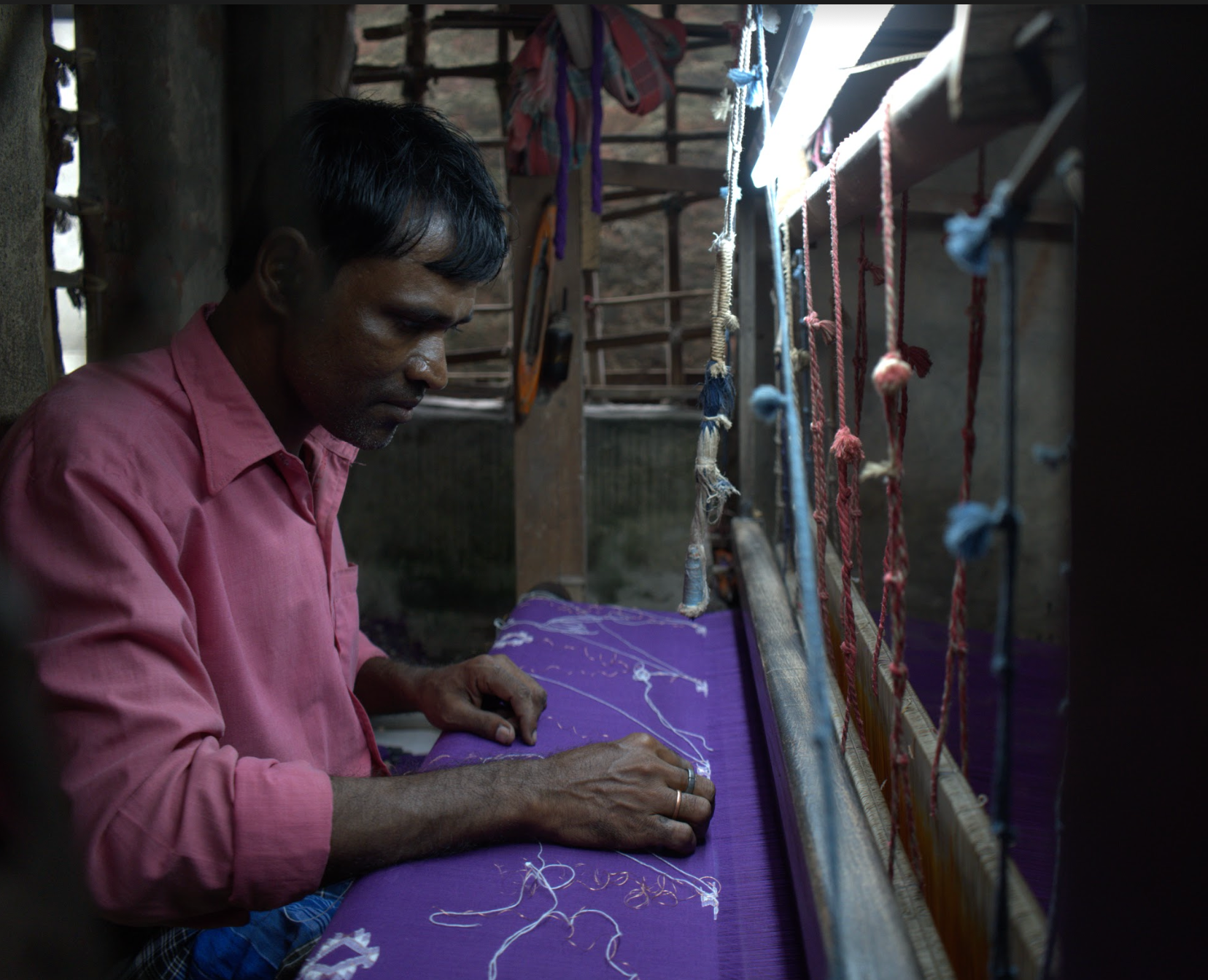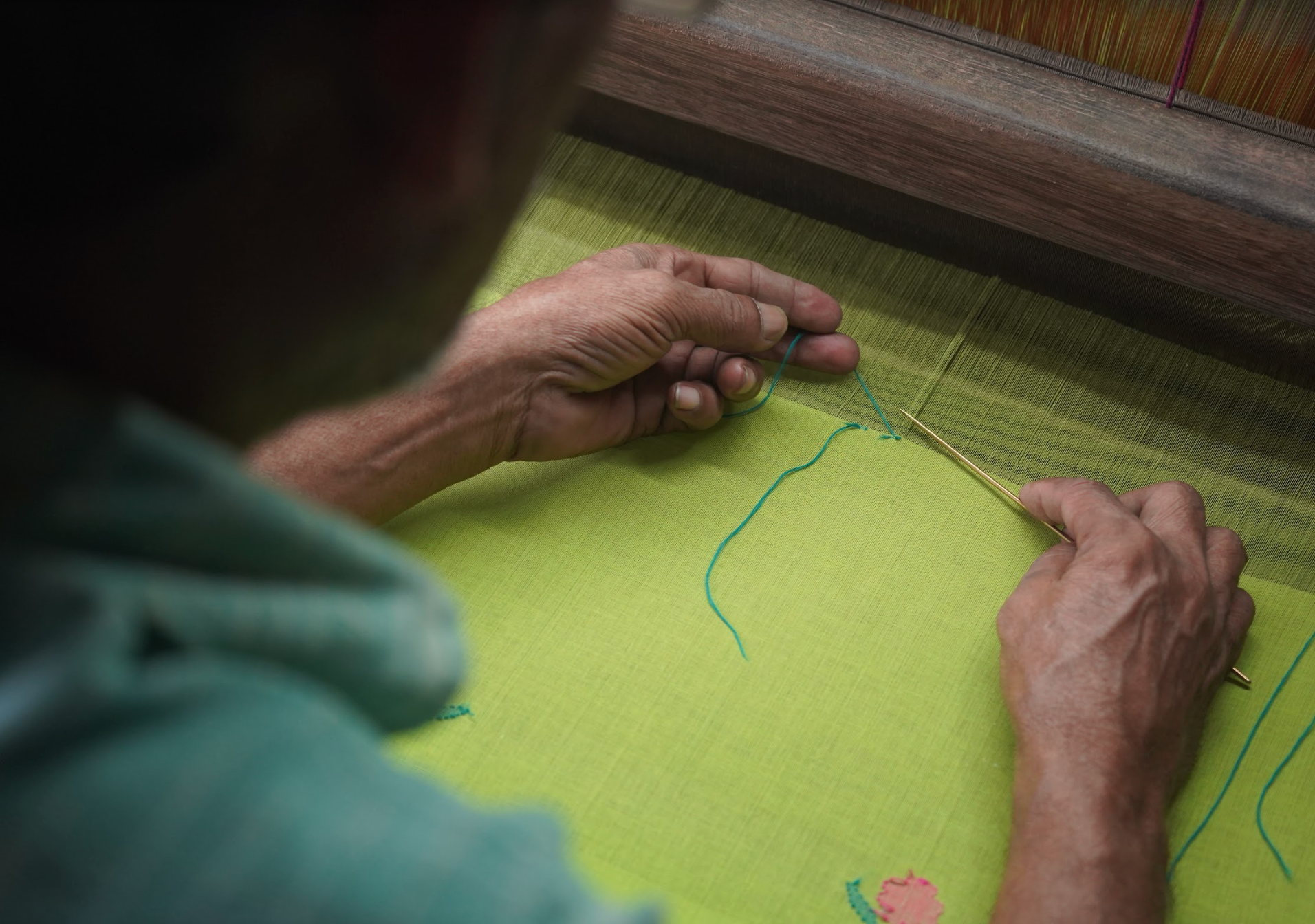 Weaving is the interlacing of two distinct yarns/threads at right angles to create the fabric/textile. The manipulation of the foot pedals to lift the warp has to be in sync with the throwing of the shuttle which carries the weft yarn. A perfect weave demands coordination between mind and body.