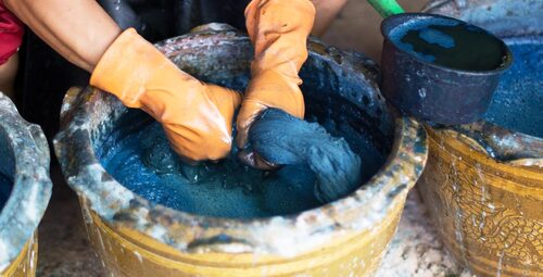 Before the weaving of any saree, the cotton yarns are dyed into desired colours. It is the process by which the natural silk yarns or cotton yarns are separated from the bundle and dipped into a soap solution, the required dye is mixed into this solution and the yarns are further dipped to absorb the colour and are kept for some time. Then the yarns are taken out and with a rod the excess of water is squeezed out from the dyed yarn. The dyed yarns are kept under the sun to dry.